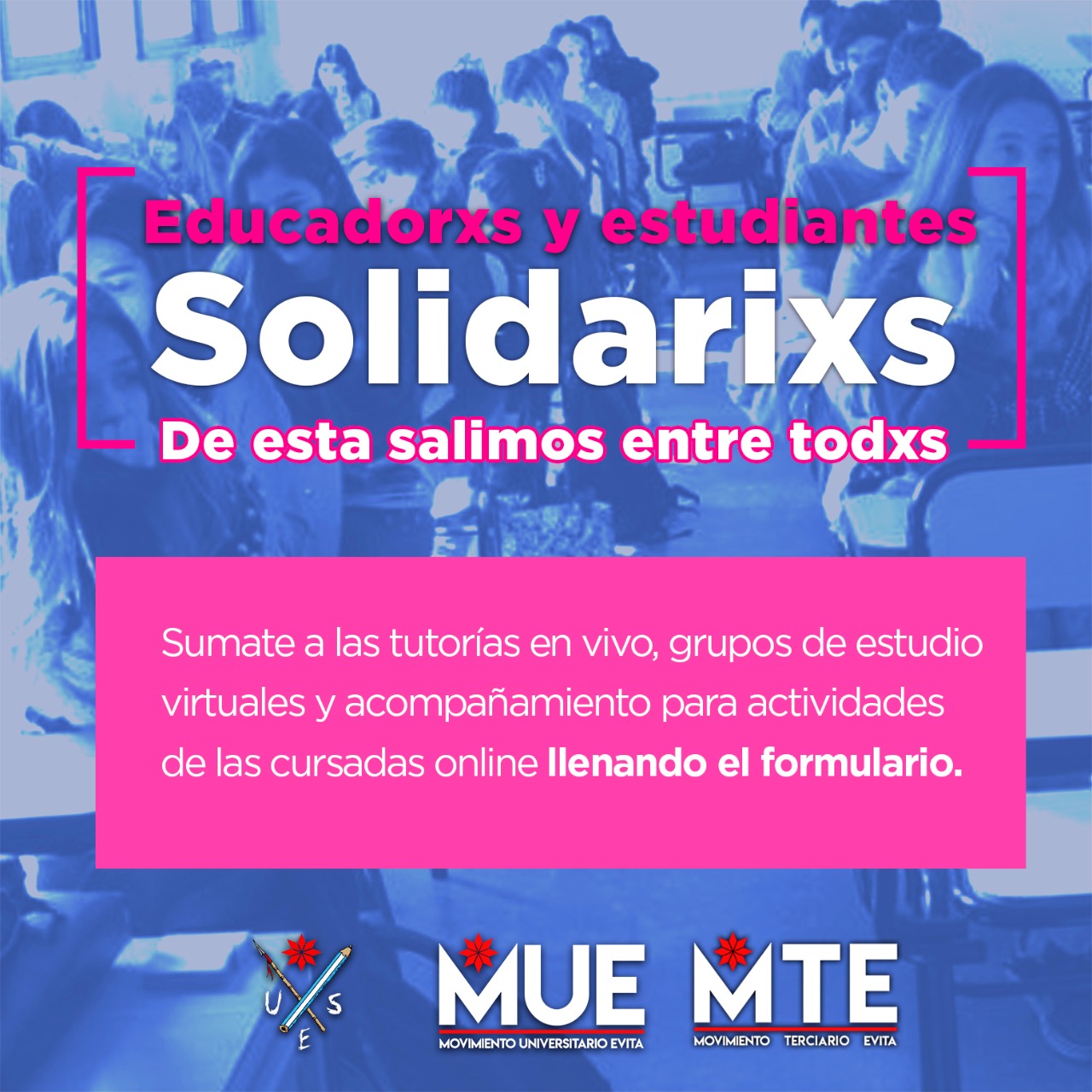 “Estamos en una primera etapa donde invitamos a aquellas personas que desde una vocación solidaria quieran realizar tutorías o grupos de estudio, lo siguiente va a ser ponernos a disposición de la ciudadanía.”, aclaró Morini. Por último invitó a “sumarse a todos los interesados e interesadas ingresando al formulario de Frente Estudiantil Evita en Instagram y Facebook”.
