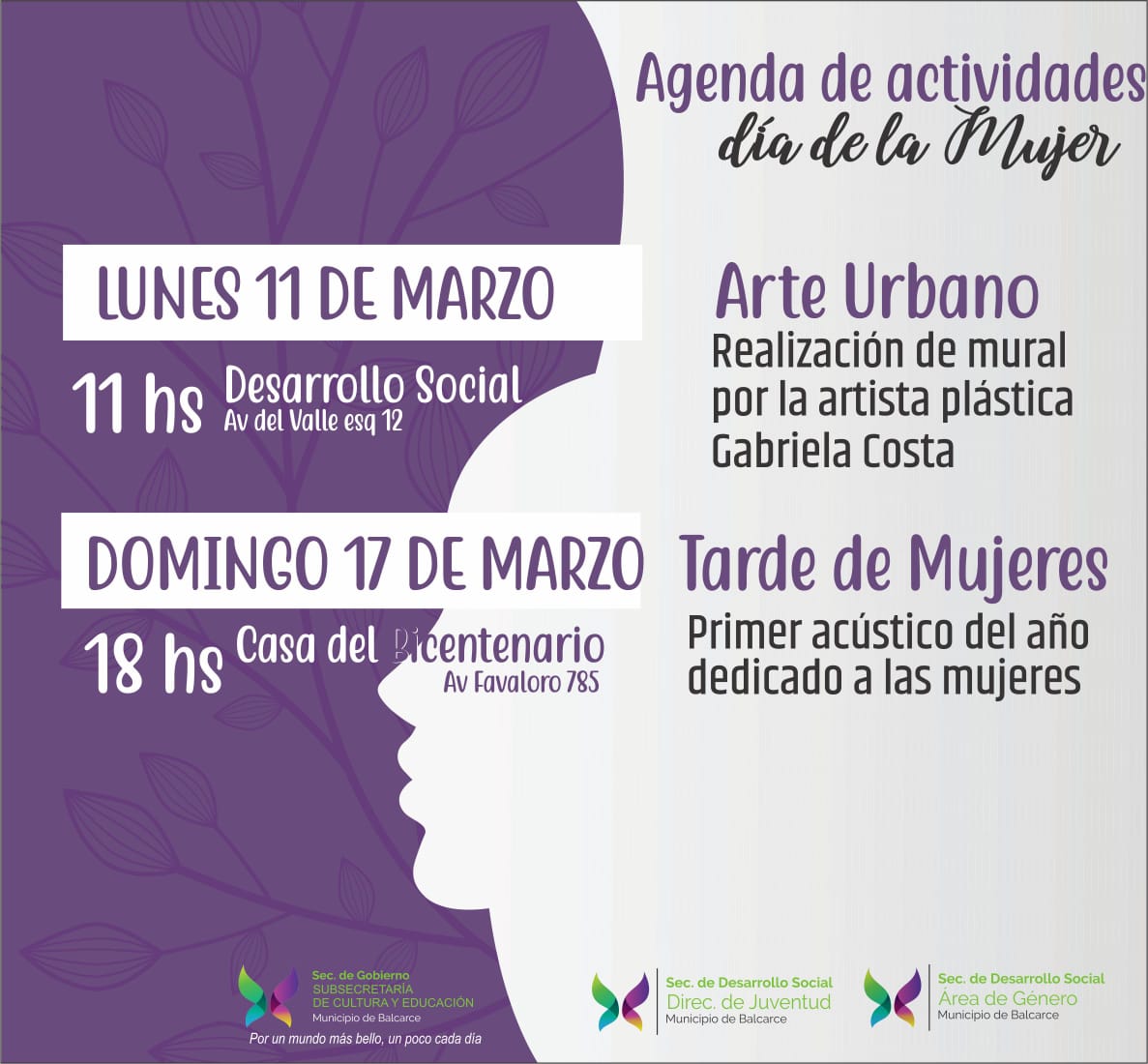 La segunda jornada será con la Subsecretaría de Cultura el domingo 17, a las 18, en Casa del Bicentenario. Allí se realizarán canciones acústicas sobre mujeres interpretadas por mujeres y hombres.