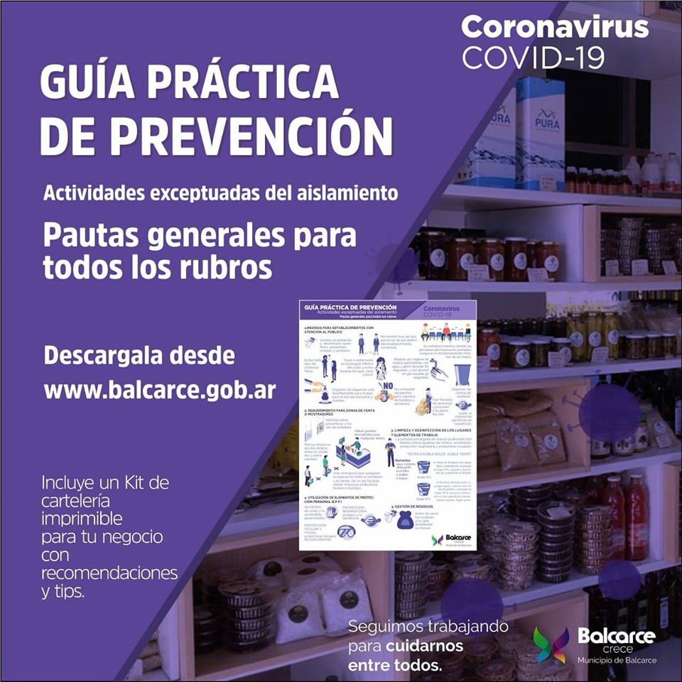 Desde la Secretaría de Gobierno, a través de la Subsecretaría de Producción y Empleo, la Dirección de Inspección General, Arbal y la Cámara de Comercio se comienza a distribuir en la jornada de hoy una guía práctica de prevención destinada a comercios y PyMEs locales. También estará disponible en www.balcarce.gob.ar.