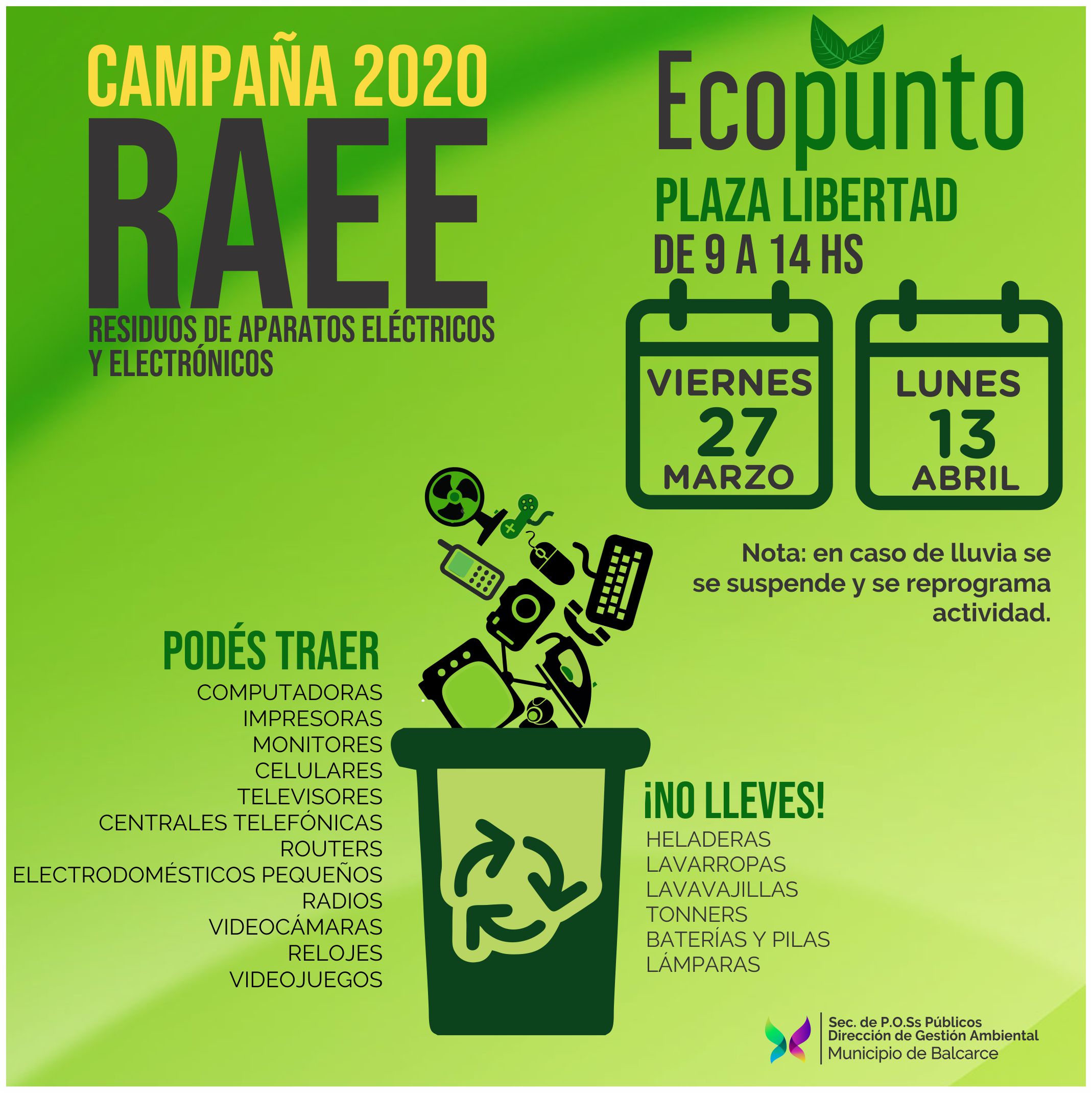 La Secretaría de Planeamiento, Obras y Servicios Públicos informa que se desarrollará la primera campaña del año de recolección de residuos electrónicos. La actividad se concretará en plaza Libertad el viernes 27 de este mes y el lunes 13 de abril, en horario de 9 a 14.
