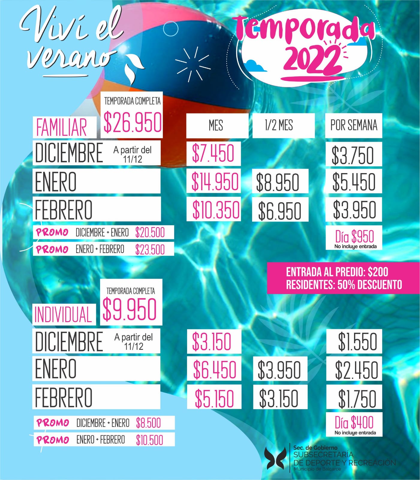 -Pileta individual: $ 400 + acceso al predio: $ 50 los menores (hasta 9 años incluidos) y $ 100 para los mayores.