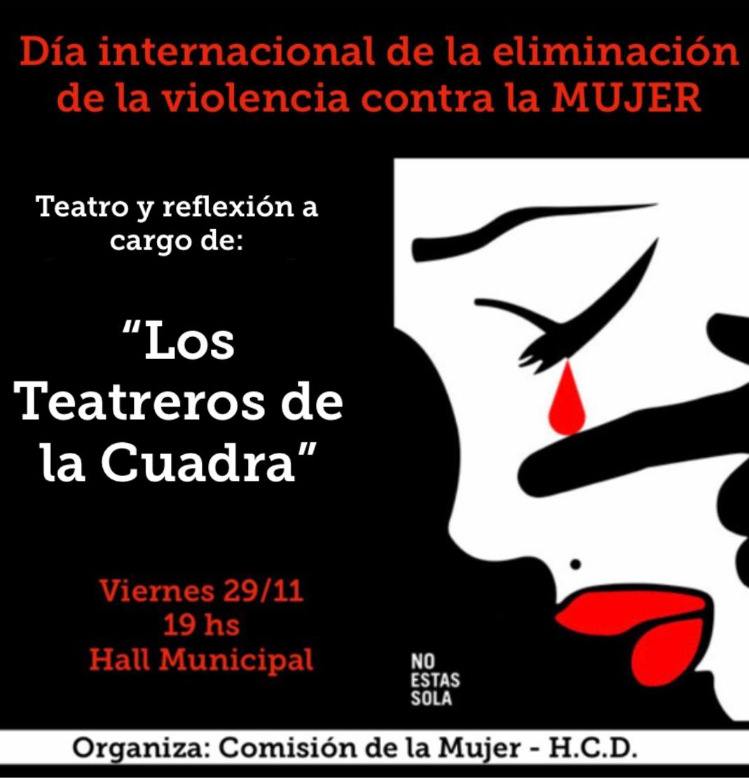 Con motivo del “Día Internacional de la Eliminación de la Violencia contra la Mujer” y aceptando la invitación de la Comisión de la Mujer del Honorable Concejo Deliberante, los “Teatreros de la cuadra” ofrecerán a la comunidad la obra titulada “Darse cuenta”.