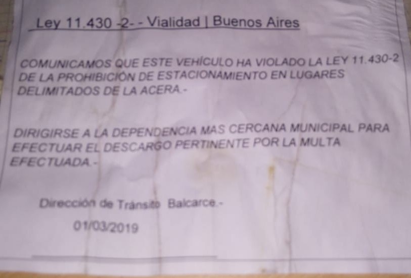 En los rodados se encontraron avisos que indican: “Comunicamos que este vehículo ha violado la ley 11430 de la prohibición de estacionamiento en lugares delimitados de la acera. Dirigirse a la dependencia municipal más cercana para efectuar el reclamo pertinente por la multa efectuada. Dirección de Tránsito Balcarce”.