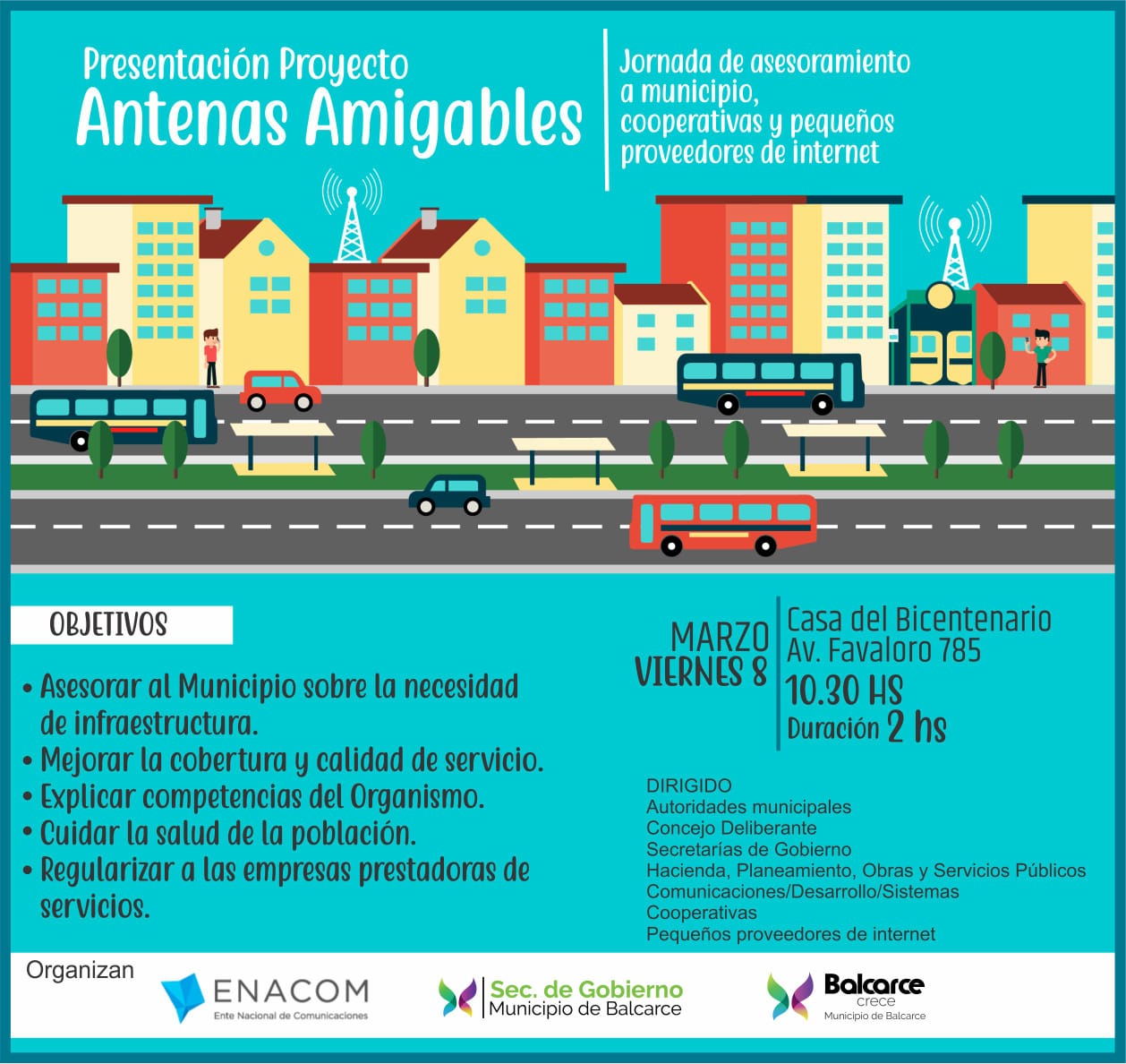 El objetivo del proyecto “Antenas Amigables” es brindar asesoramiento sobre la necesidad de infraestructura, mejorar la cobertura, calidad del servicio y explicar competencias del organismo. Asimismo, se explicará la forma de cuidar la salud de la población y regularizar a las empresas prestadoras de servicios.