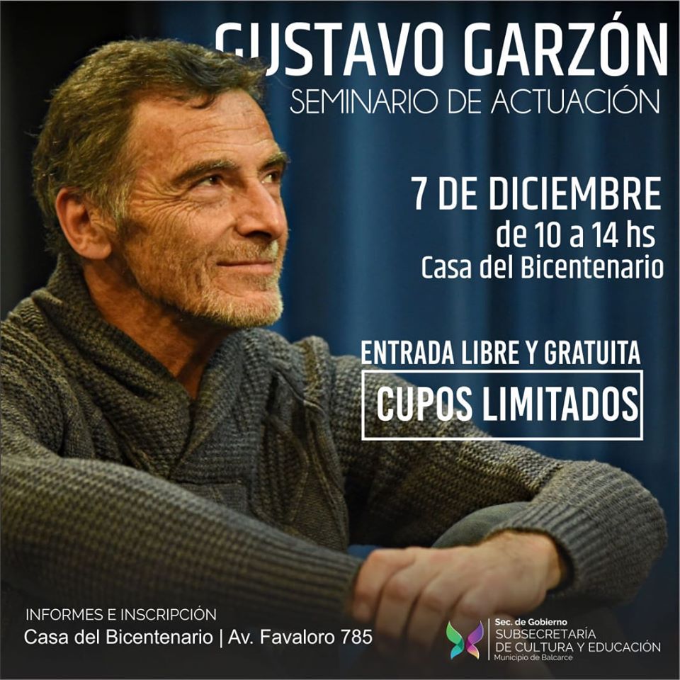 La Subsecretaría de Cultura y Educación informa que el reconocido actor Gustavo Garzón se presentará en Balcarce con motivo de brindar un seminario de actuación de manera gratuita. La actividad se concretará el sábado 7 de diciembre, de 10 a 14, en la Casa del Bicentenario. Se recomienda a los interesados inscribirse en la sede ubicada en avenida Favaloro 785 teniendo en cuenta que habrá un cupo limitado.